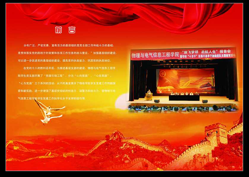 “党旗引领工程”将党员的教育贯穿在一个系统的引领过程中,核心在于“引领”。学院以学生支部为组织单位,以学生党员和入党积极分子为活动主体,每年根据当前社会形势和学生思想实际,坚持围绕一个主题集中开展党建活动,并将每年的11月份确定为学生党建活动主题月,系统实施三个引领。几年来,以“感恩教育”、“社会责任教育”、“雷锋学习教育”、“地球一小时教育”“学习张丽莉教育”为主题,共组织了多项主题活动。2010年的“学会感恩,共创和谐——青春与责任同行”主题党建活动,以感恩教育为切入点系统引领学生的感恩意识;2011年,恰逢建党九十周年,党建活动以“党旗引领 争做先锋”为主题,以先锋教育为切入点,使学生党员在重温党的光辉历史和革命传统教育过程中进一步增强党性意识。2011年的“12.9学习红色革命”主题党建活动,以红色革命为切入点,激发学生党员同祖国同呼吸、共命运,投身建设的使命感,培养党员强烈的爱国责任感;2012年的“大美大爱张丽莉”主题党建活动,结合bat365毕业生张丽莉的事迹,以责任教育为切入点,弘扬高尚师德教育。