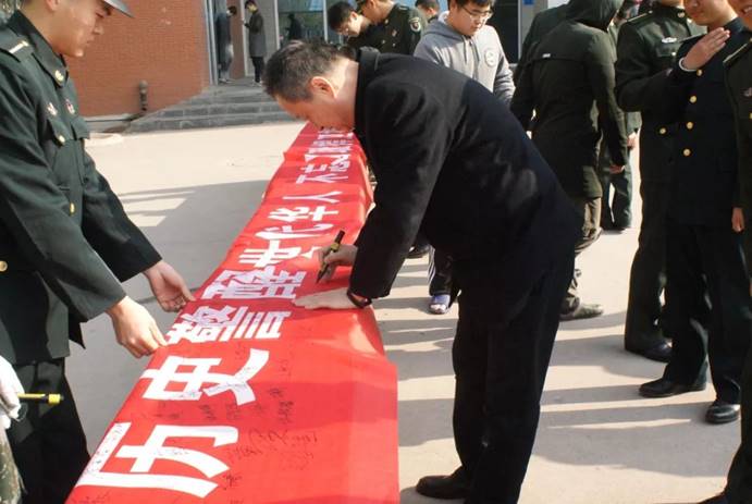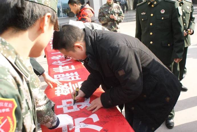 中午11时30分,士官学院联合朝阳国旗护卫队在第一餐厅门口举行“勿忘国耻,吾辈自“为主题的国家公祭日签名活动,活动现场刚刚布置完毕,便有师生走过来主动的拿起笔郑重的签上了自己的名字,士官学院和朝阳国旗护卫队的工作人员也积极的向路过的师生邀请他们加入这个签名活动中来,有很多同学在准备的白鹤写下“勿忘国耻、吾辈自强、振兴中国”等等纪念国家公祭日的话语。“忘了历史等于背叛过去”一位老教授郑重的对同学们讲到。