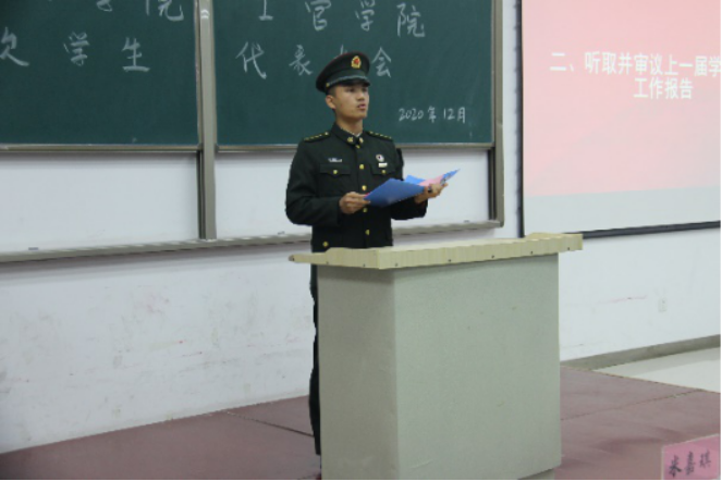 会议首先听取并审议了上一届学生会工作报告。士官学院学生分会主席团成员赵庚代表士官学院学生会向大会作工作报告,报告从工作回顾与反思展望两个方面展开汇报,总结我院学生会近年来的工作重心及取得的成绩,并对未来学生会工作提出思路建议。