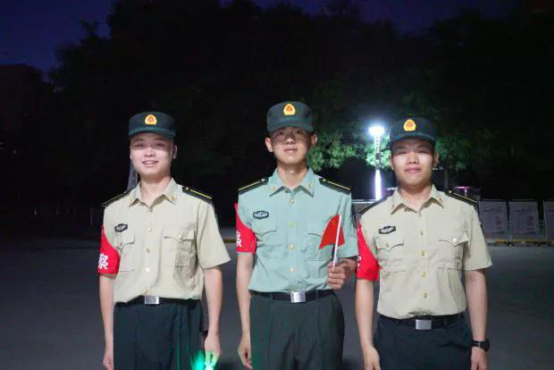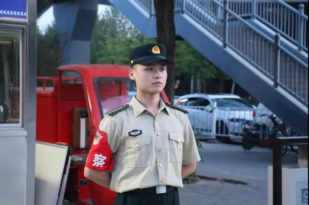 道旁路边,纠察队员们严阵以待给予同学们安全保障