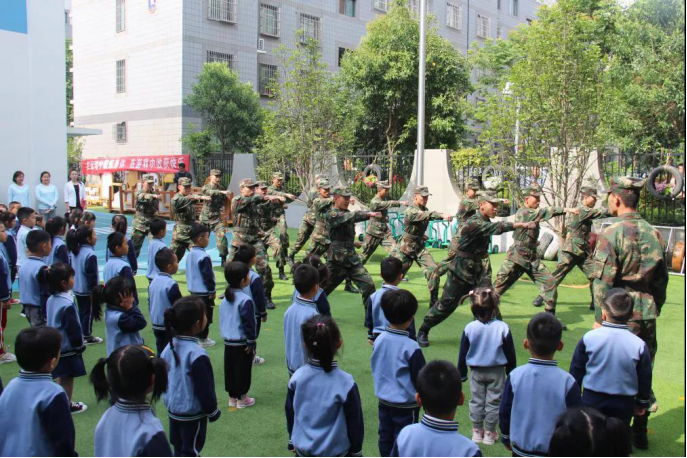在升旗仪式结束后,士官生进行了一次拳术表演表演示。士官生气势磅礴,敏捷精准的军体拳赢得了满堂喝彩。直观地向师生们展示了“雄赳赳,气昂昂”的士官生风采,军人的气概、军人的灵魂播进这些朝气蓬勃的小学生心中。