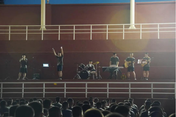 “慌慌张张匆匆忙忙 为何生活总是这样……”士官学院乐队的同学们演奏的《活着》,成功带动了全场氛围,在同学的欢呼声尖叫声中结训晚会拉开帷幕!