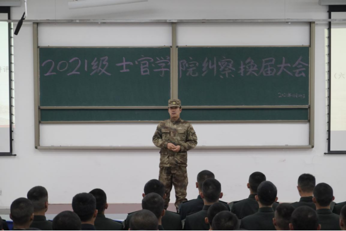 为强化士官生条令意识、纪律观念,提高士官学院军事化管理水平,确保纠察工作的连续性和稳定性。11月24日,士官学院在第三阶梯教室举办2021年纠察换届大会。士官学院军政教官张亚峰与全体纠察队员参加本次大会。