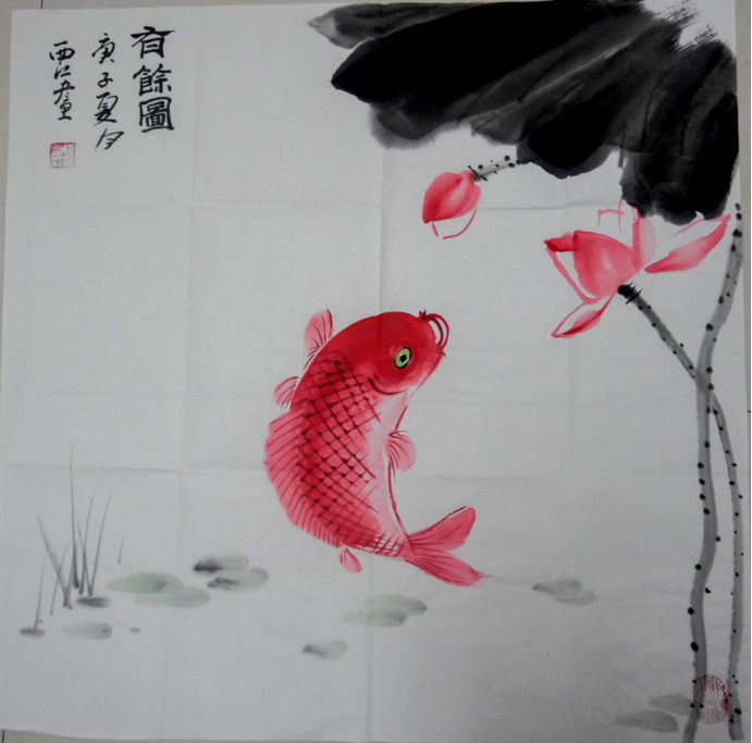 意义:莲花,洁白,出尘离染,寓意和和美美; 取余的含义,寓意年年有余,喜庆祥和。鱼游莲花笑。偏下一隅,几抹水草、浮萍,叙述鲤鱼不是无根之物,整个画面和谐美好,莲花洁净,鱼儿欢跃,场景喜庆俏皮,更为以后的日子增光添彩。跳出水面的鲤鱼,使整个画面静中有动,充满着一种向上的力量!
