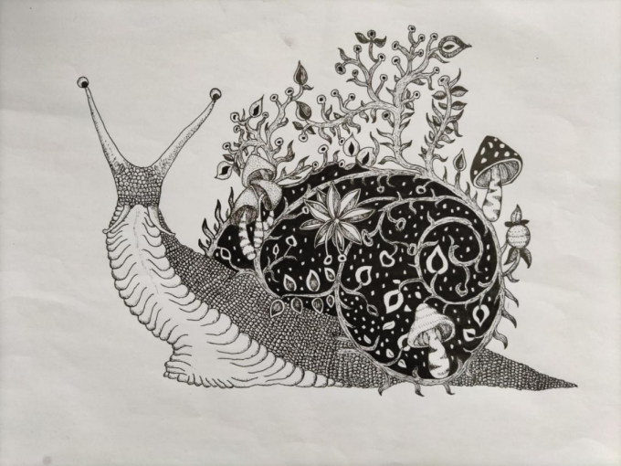 意义:蜗牛在日常生活中是行动力迟缓的代表,而蜗牛身上的壳也代表了当代人面对生活时的压力;当一只蜗牛不断成长前进,那么它的身上就不再是空无一物,植物装点蜗牛壳,同样也能装饰它的心,此时此刻,曾经是负担的蜗牛壳就被赋予了意义,是蜗牛前进路上的纪念碑。