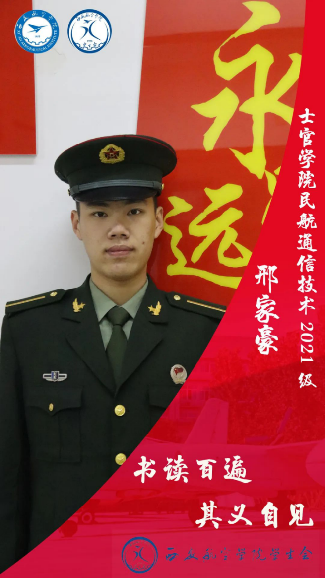 邢家豪,男,汉族,航信212D班学生,现任士官学院学生会主席团成员。入校以来,获得2021-2022学年国家奖学金,“校级优秀学生”一等奖学金以及西航铸剑杯二等奖等奖项。春蚕到死丝方尽,人至期颐亦不休。一息尚存须努力,留作青年好范畴。要立志将热血挥洒在实现强军梦的伟大实践之中,在军队这个大舞台上施展才华,在军营这个大熔炉里淬炼成钢,书写绚烂、无悔的青春篇章。