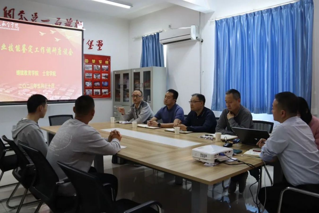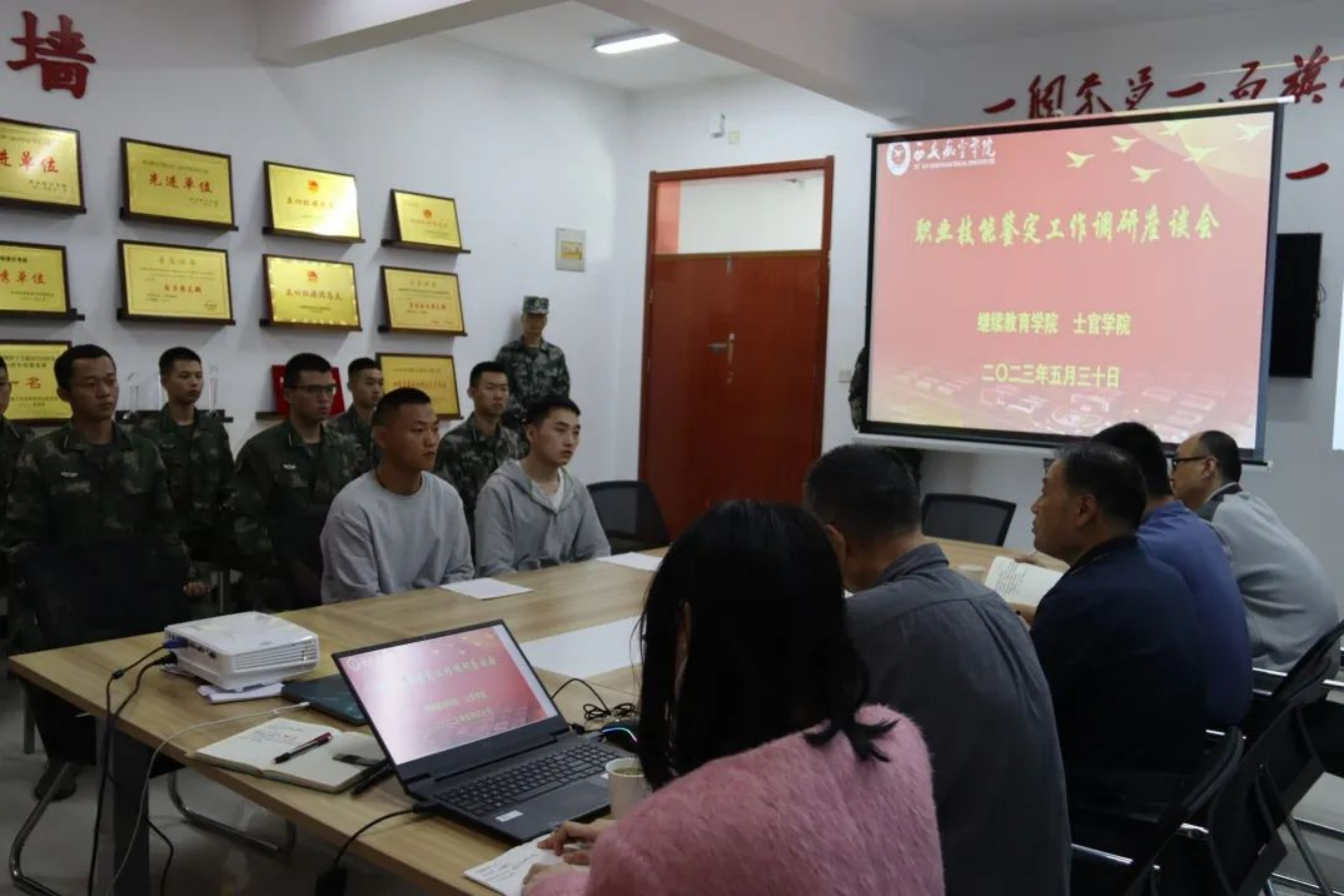 5月30日,继续教育学院、士官学院在阎良校区三号公寓3401会议室,开展军士生职业技能等级认证工作调研座谈,继续教育学院院长孙忠孝、副院长苗海峰、综合管理办公室主任许强、等级认证指导老师周莹,士官学院2021级12名军士生骨干代表参加。会议由士官学院党总支书记、院长张军主持。