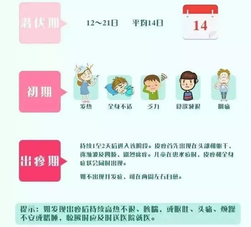 患了水痘的人,通常会出现发烧、发痒的红疹,最初这些红疹先是扁平,其后形成突起的小水泡,水痘属于向心性分布,一般前胸、后背会先出,且分布较密集,然后向其他部位蔓延,面部也会比较多,四肢少一些。不过严重时,也可能全身分布。持续3-4天,然后变干、结痂。完全痊愈大约需要2-3周时间。水痘潜伏期长(10-24天平均14-16天)且有隐性感染者存在。