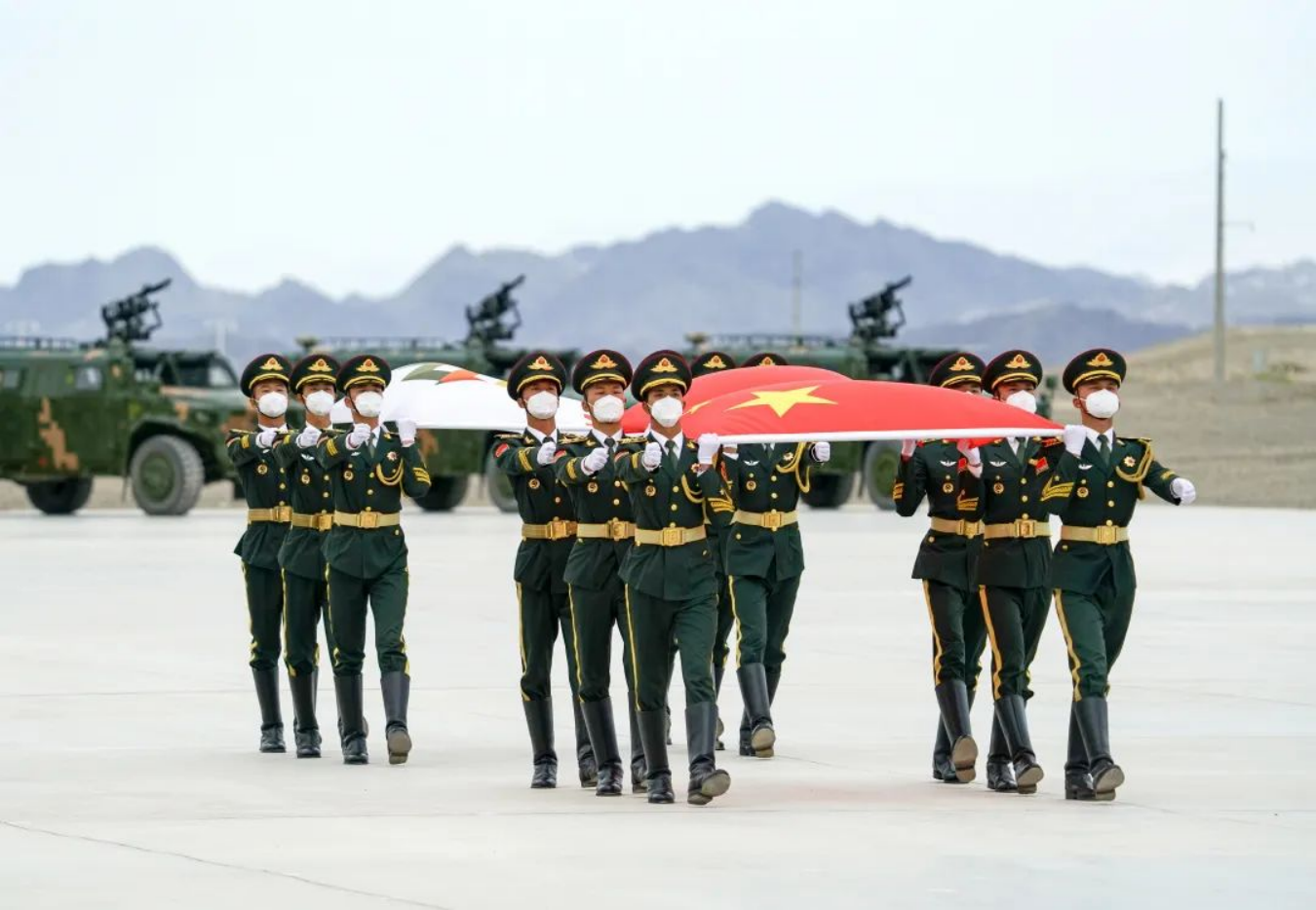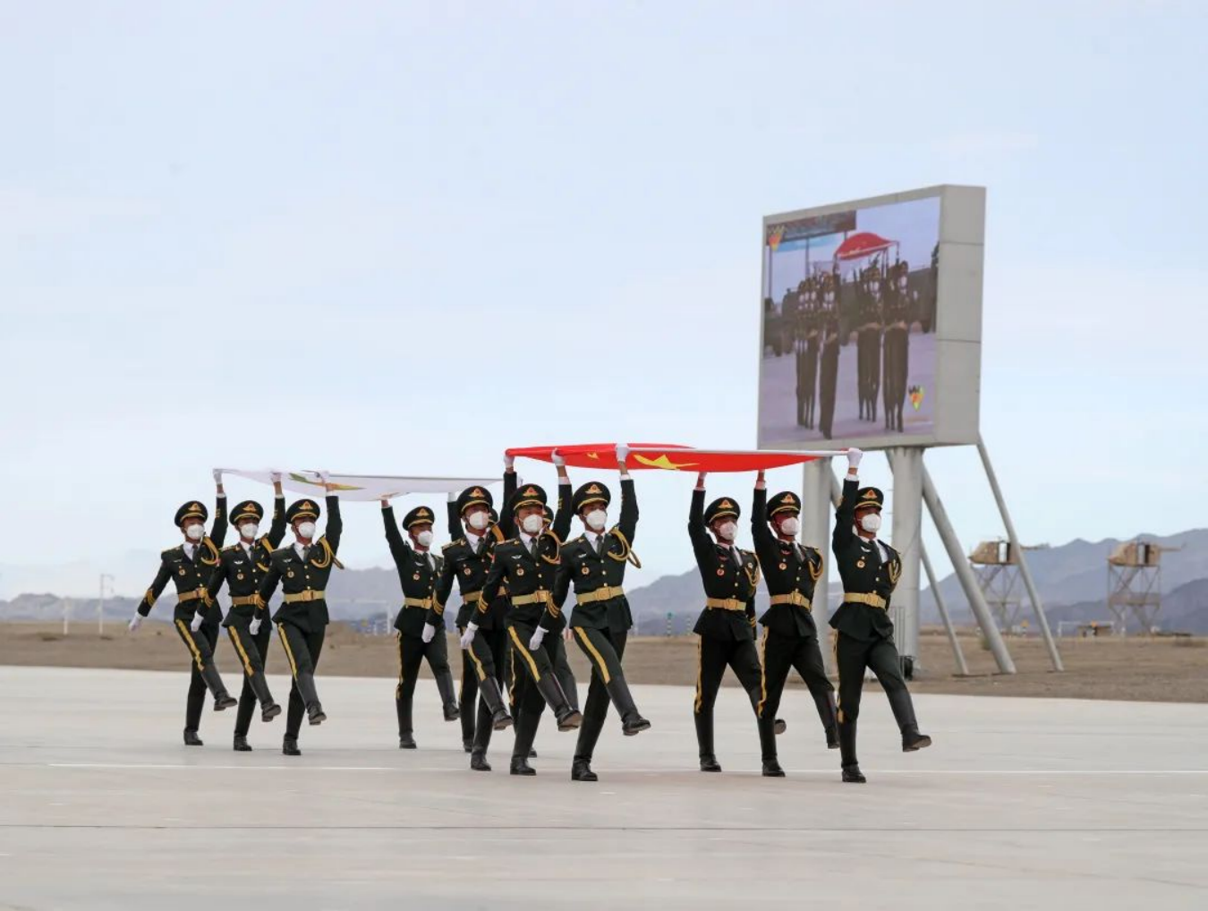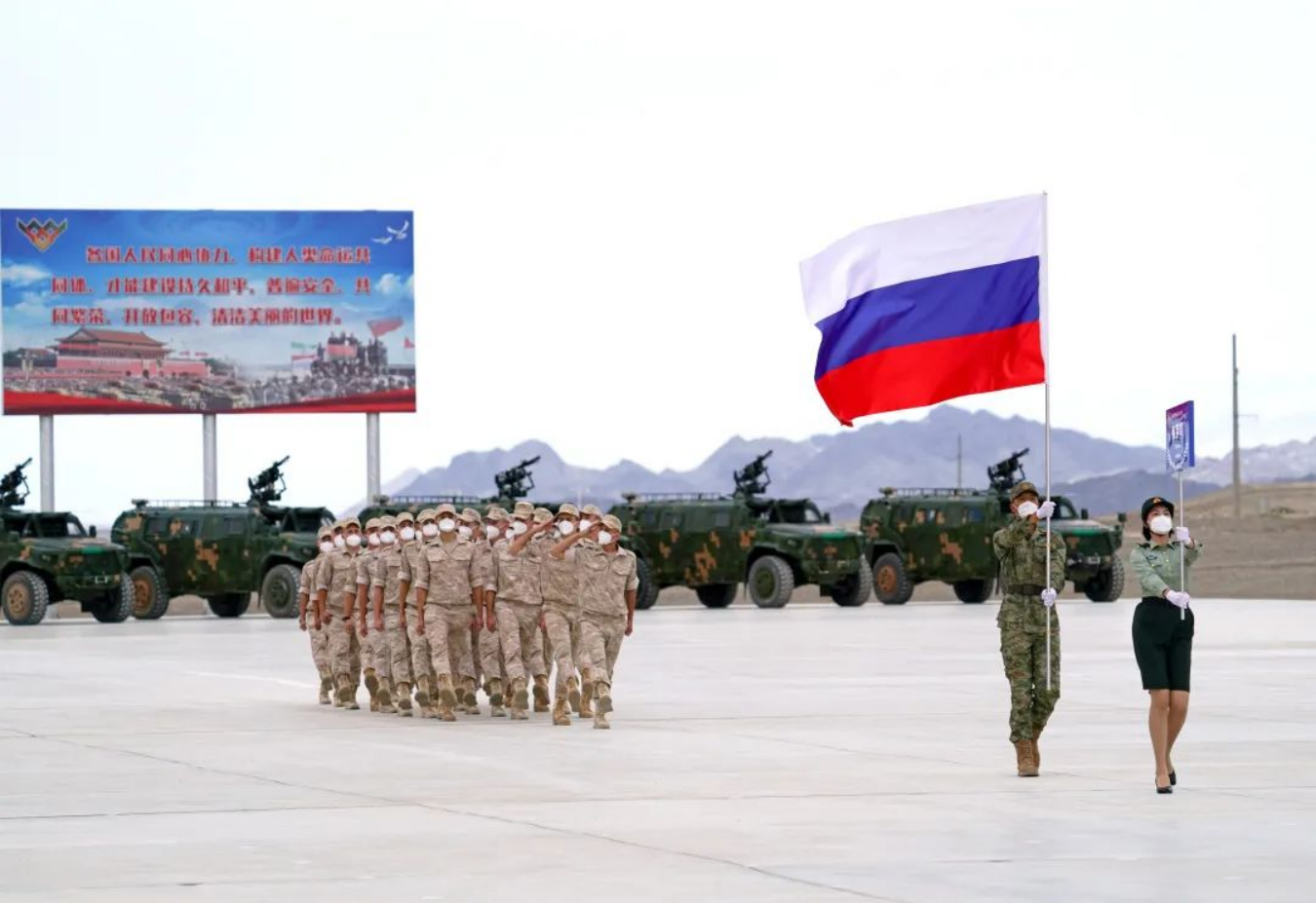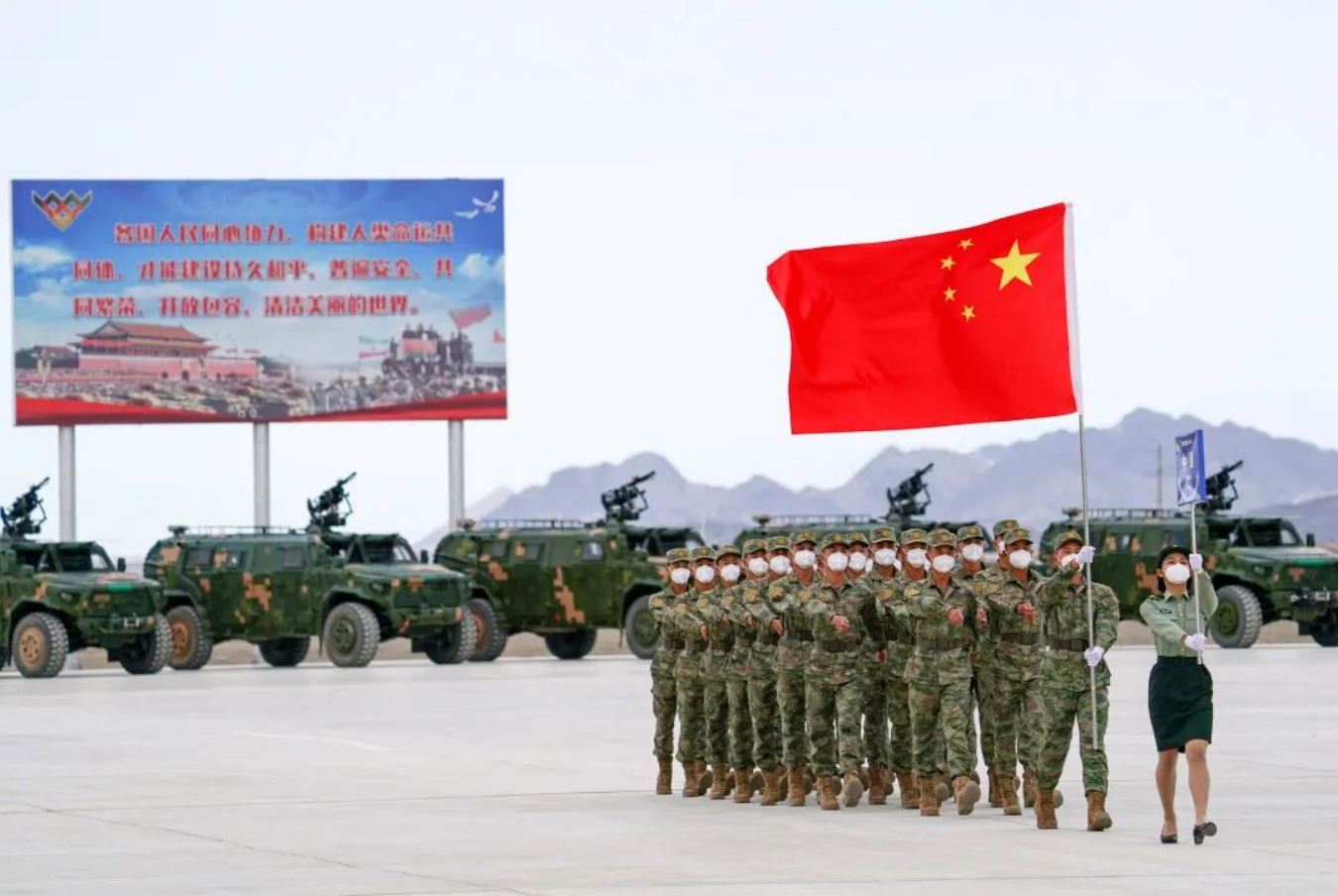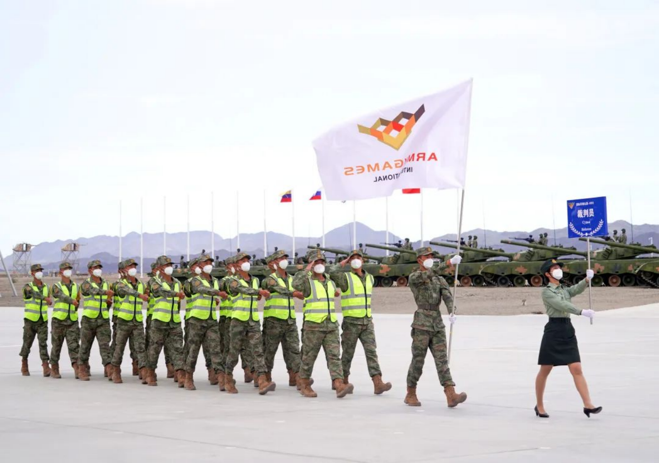 8月13日,“国际军事比赛-2022”中国库尔勒赛区比赛开幕,五星红旗和“国际军事比赛”会旗入场。新华社发(栾铖 摄)