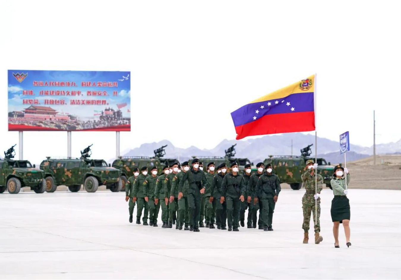 8月13日,“国际军事比赛-2022”中国库尔勒赛区比赛开幕,委内瑞拉参赛队走过主席台。新华社发(栾铖 摄)