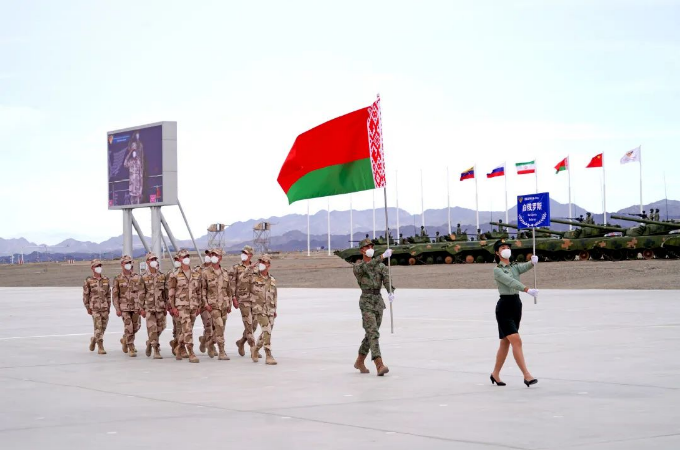 8月13日,“国际军事比赛-2022”中国库尔勒赛区比赛开幕,白俄罗斯参赛队走过主席台。新华社发(栾铖 摄)