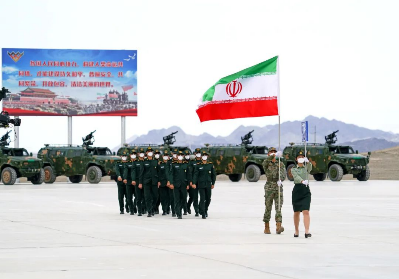 8月13日,“国际军事比赛-2022”中国库尔勒赛区比赛开幕,伊朗参赛队走过主席台。新华社发(栾铖 摄)