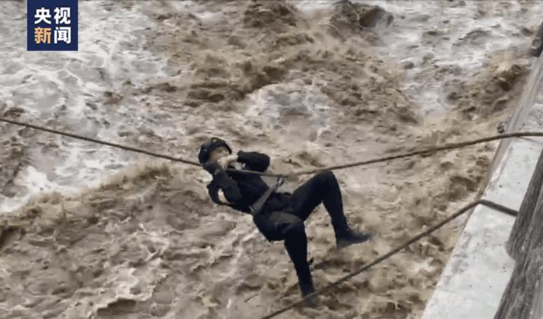 2022年9月5日,四川甘孜州泸定县发生6.8级地震,磨西镇与青岗坪交汇处,湍急的流水拦住去路。甘孜特警队员们用身体和绳索搭建桥梁,徒手爬绳索前往对岸救援。图片来源:央视新闻视频截图