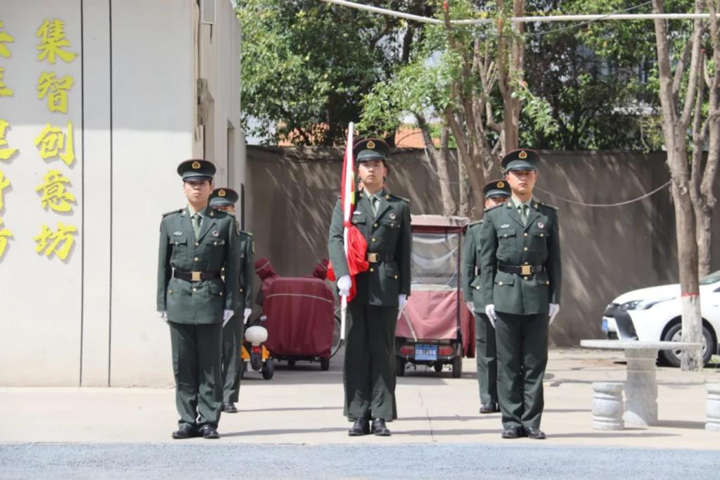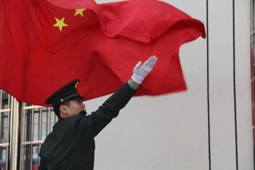 扬雄风,挺傲骨,步履铿锵;升国旗,奏国歌,红旗飘扬。国旗护卫队肩扛鲜艳的五星红旗,那面承载着国家尊严与民族荣耀的五星红旗,在人们的注目礼中冉冉升起。这一刻,全体人员肃穆站立,目光紧紧跟随飘扬的五星红旗,深情颂唱国歌,共同祝福伟大祖国繁荣昌盛。