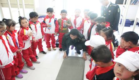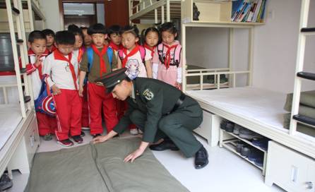 研学第一站,组织小学生参观我院士官学员宿舍,我院志愿者认真为同学们做叠军被示范,并手把手教同学们叠军被,体验军营生活,培养同学们守纪、服从命令的意识。