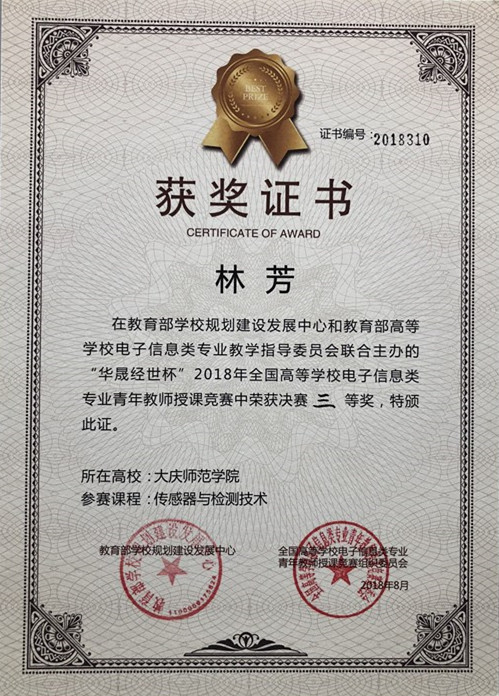 2018年8月30日,由教育部学校规划建设发展中心、教育部高等学校电子信息类专业教学指导委员会联合主办的“华晟经世杯”2018年全国高等学校电子信息类专业青年教师授课竞赛,在河北工业大学举行决赛。本次竞赛从2018年1月份开始,历时8个月,全国100多所高校,包括南京邮电大学、国防科技大学和哈尔滨工程大学等电子信息类知名大学,400多名教师报名参赛。bat365bat365中文官方网站林芳老师在获得初赛华北赛区二等奖后,在决赛中获得全国三等奖。