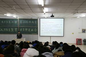 伊始,成宝芝主任为同学们简单介绍了本次大会的流程、各位专业课老师以及他们在教学中的突出成绩。随后,向同学们说明了电子信息工程专业的概况,以及所需具备的专业能力。成宝芝主任提倡“面向地方发展,培养优秀人才”的方案,并着重强调创新能力教学的培养并教导同学们要树立自强、自立、自尊。随后由王凤嫔老师向同学们宣读学生学业导师具体制度,使同学们深入了解了学业导师制的具体情况。见面会临近尾声,同学们与导师相互交流,拉近了同学们与老师间的距离。