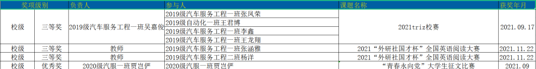 2021年以来,机电学子积极参加各类比赛并取得佳绩。2021年8月20日至11月28日,各项比赛累计获奖共12项,其中,省级比赛二等奖5项、三等奖3项;校级比赛三等奖3项;优秀奖1项。