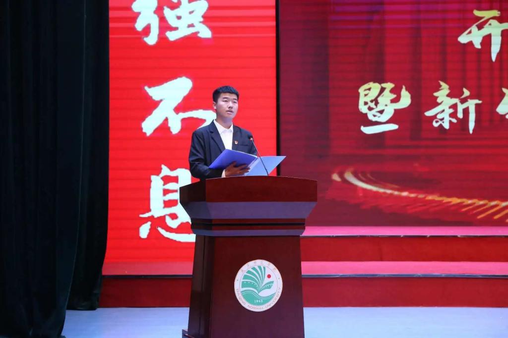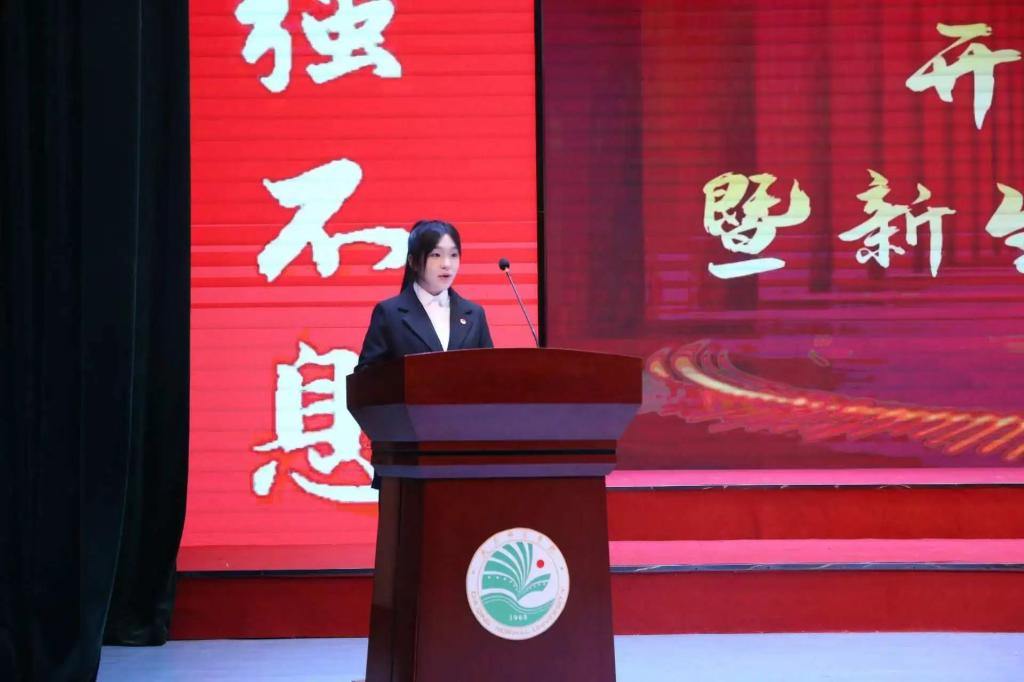 新生代表蔺枫茹阐述了初入大学生活的感受,表明对未来大学生活的态度,要勇敢面对挑战、团结友爱铸美好校园生活,积极向上以饱满热情对待每一天。