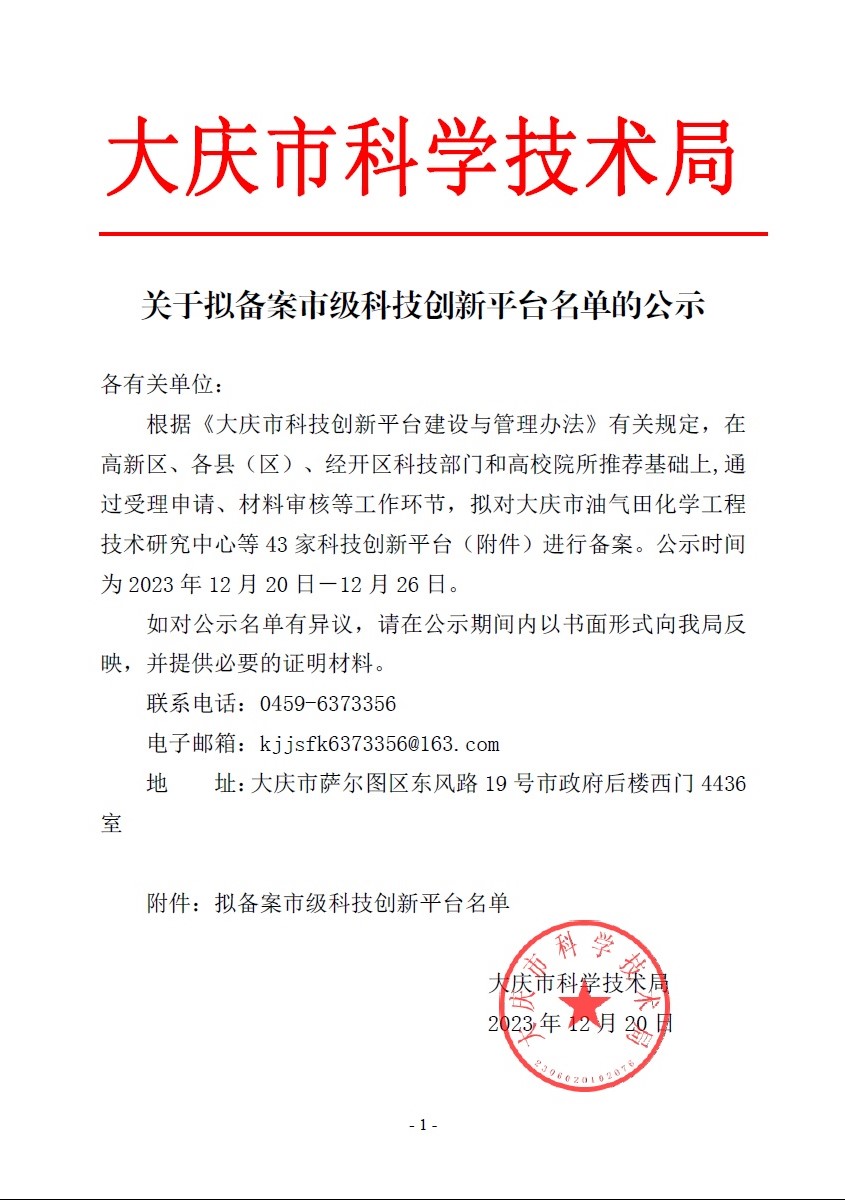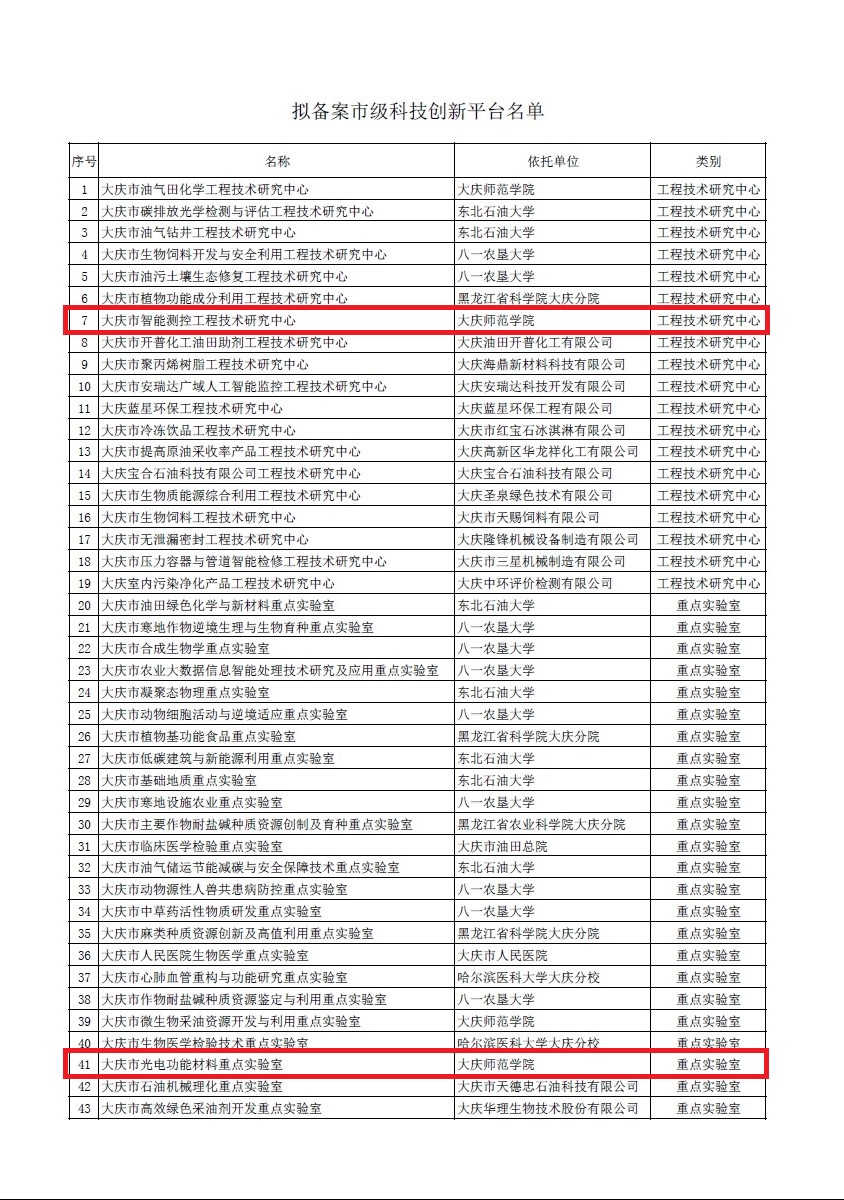 近日,大庆市科学技术局公布了市级科技创新平台名单,全市合计43家科技创新平台入选。bat365申报的“大庆市智能测控工程技术研究中心”、“大庆市光电功能材料重点实验室”成功获批备案。