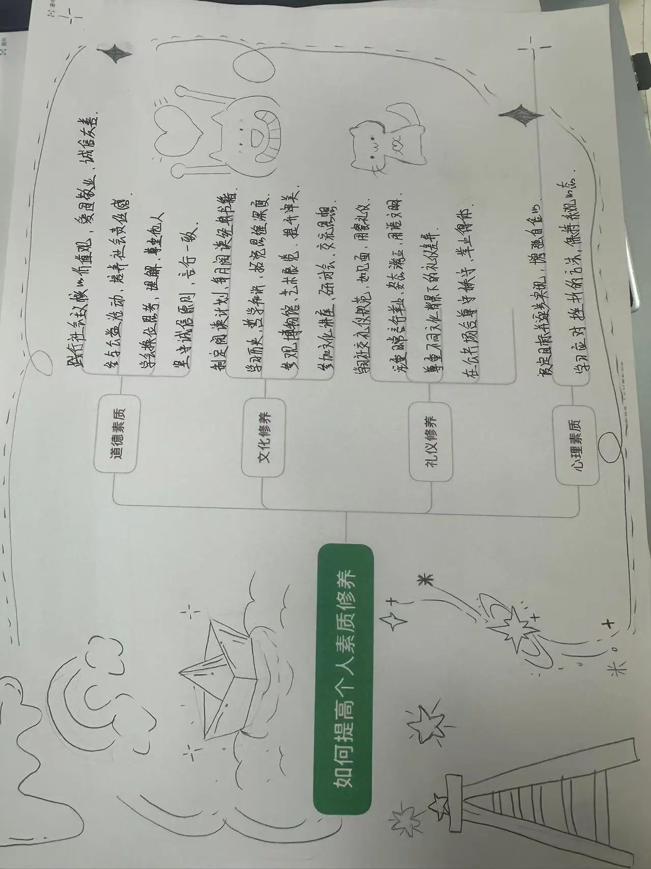 分享结束后,有同学用思维导图进行总结,将个人修养提升分为“道德素质、文化修养、礼仪修养、心理素质”四个方面,并用清晰的分支展示了每一项提升修养的方法。这种思维导图不仅帮助同学们系统化地理解如何提升个人修养,也为大家提供了具体的操作路径和实践步骤,使同学们能够在日后的生活中逐步践行。