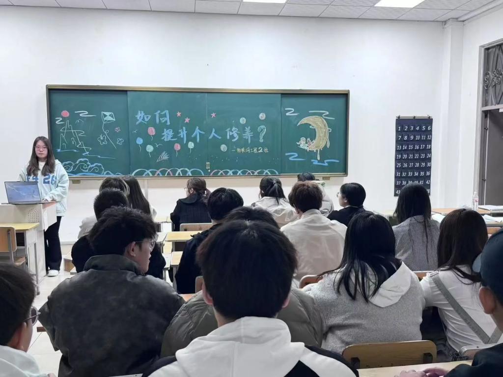 在文章分享环节,同学分享她撰写的《自我反省与成长》的文章。她提到,在大学期间,自己曾面临着自律困难和情绪管理的挑战。通过不断的自我反省和借助心理辅导,她逐渐学会如何平衡学业与个人生活,提升自己的心理素质和情绪控制能力。她的分享使大家深刻体会到,个人修养不仅仅是外在行为的规范,更多的是内心的自我管理和自我提升。