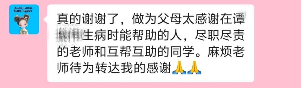 目前,六名同学中有两名符合条件的同学成功献血,其他几名同学明天献血,为谭同学的治疗提供了宝贵的帮助。谭同学的家长得知此事后,非常感动。他们向老师和献血的同学表达了深深的感谢。家长动情地说:“真的谢谢了,作为父母,我们太感谢在谭同学生病时能给予帮助的人,尽职尽责的老师和互帮互助的同学。麻烦老师代为转达我们的感谢。”