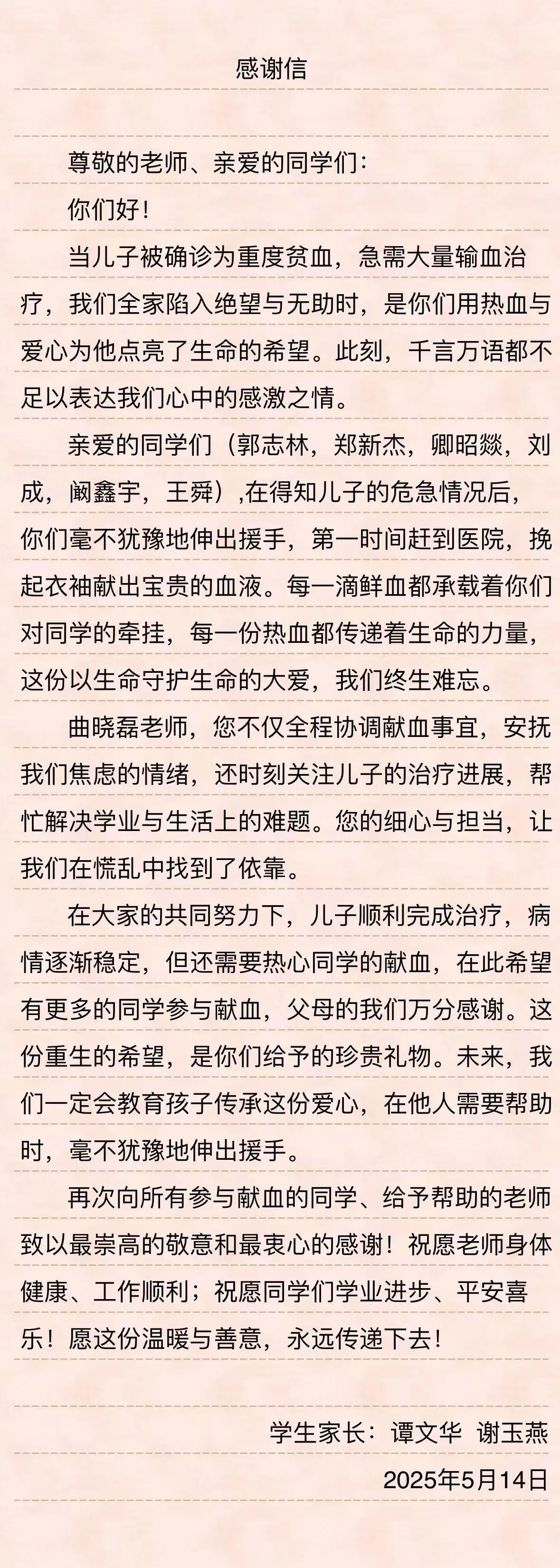 这场爱心接力,让我们看到了校园中浓浓的师生情、同学情。老师用实际行动诠释了对学生的关爱与责任,同学们用热血传递着温暖与希望,家长的感谢信则让这份爱更加深沉而动人。相信在大家的关爱下,谭同学一定能早日康复,重返校园,与老师和同学们一起,继续书写美好的青春篇章!让我们为这些充满爱心的同学点赞,也希望这份温暖与爱能够在校园里继续传递,温暖更多的人!